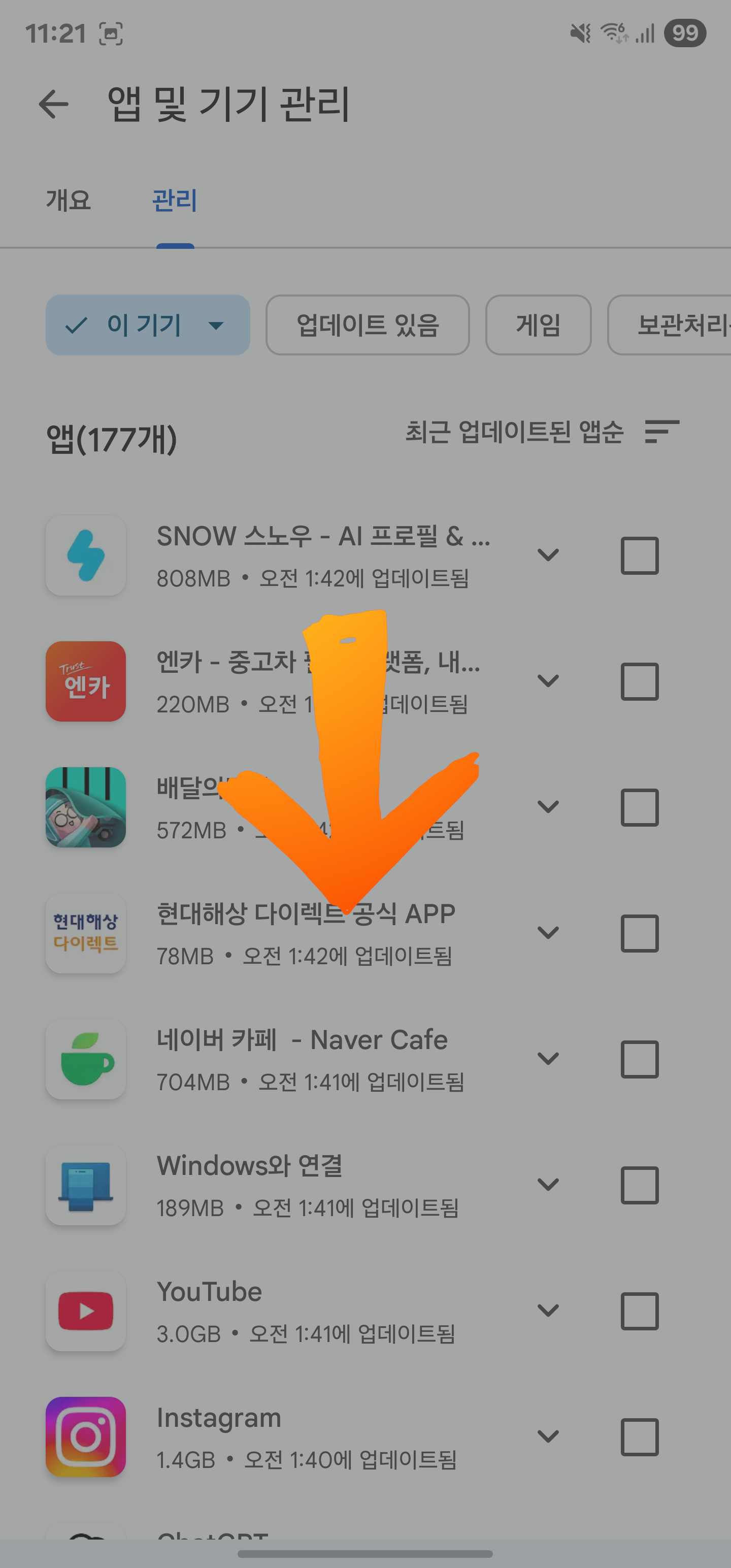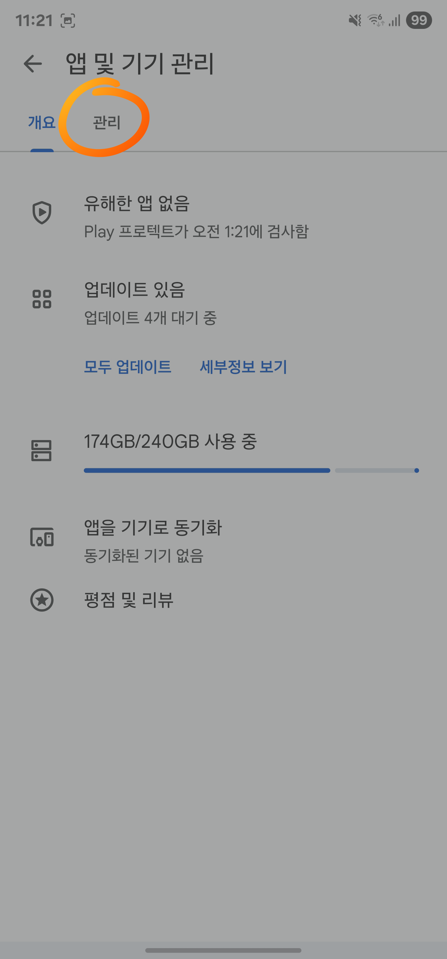 3. 앱 및 기기 관리 화면에서 [관리] 탭 선택