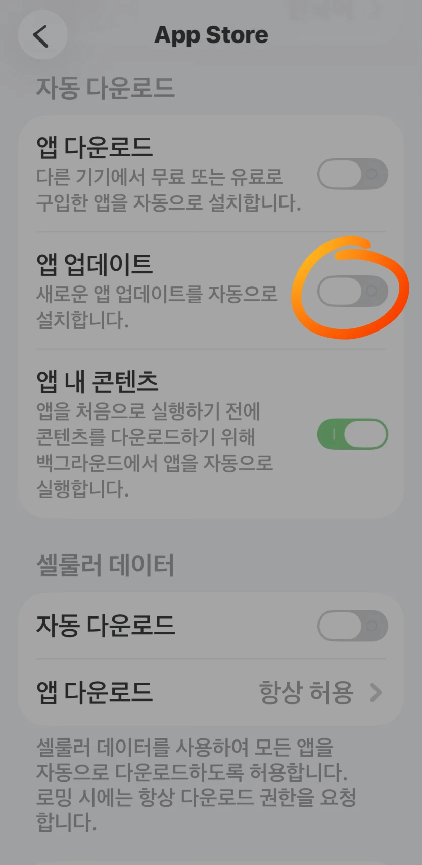 - 자동 다운로드 > ‘앱 업데이트’ 항목 스위치 비활성화