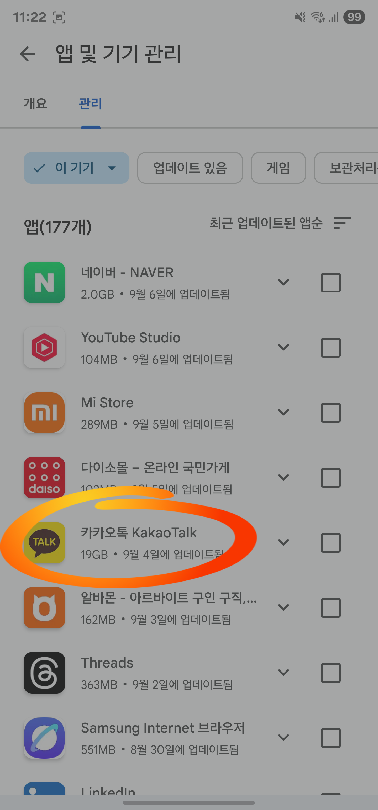 4. 관리 탭의 앱 리스트에서 아래로 내려서 [카카오톡 앱 찾기]