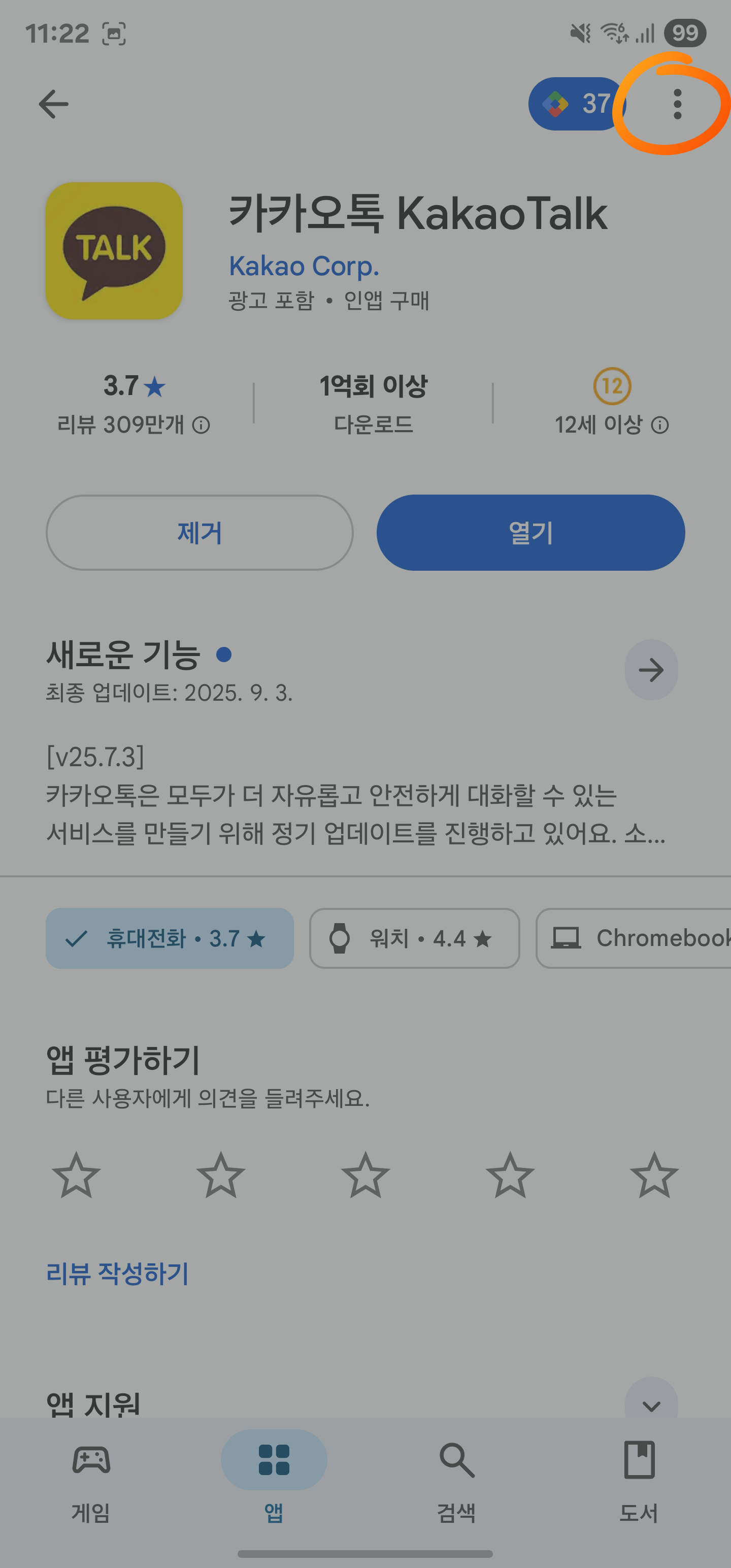 6. 카카오톡 앱 선택 화면 오른쪽 상단의 [점 세 개 아이콘 선택]