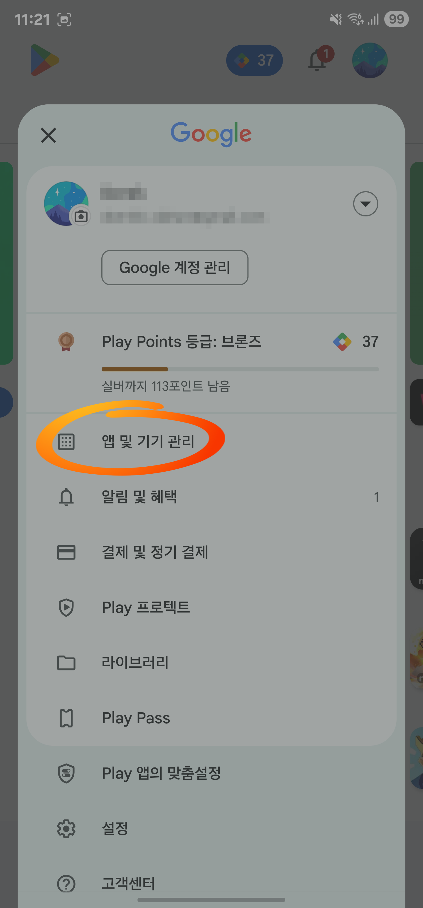 1. 구글 플레이스토어 실행 후 오른쪽 상단 프로필 이미지 선택