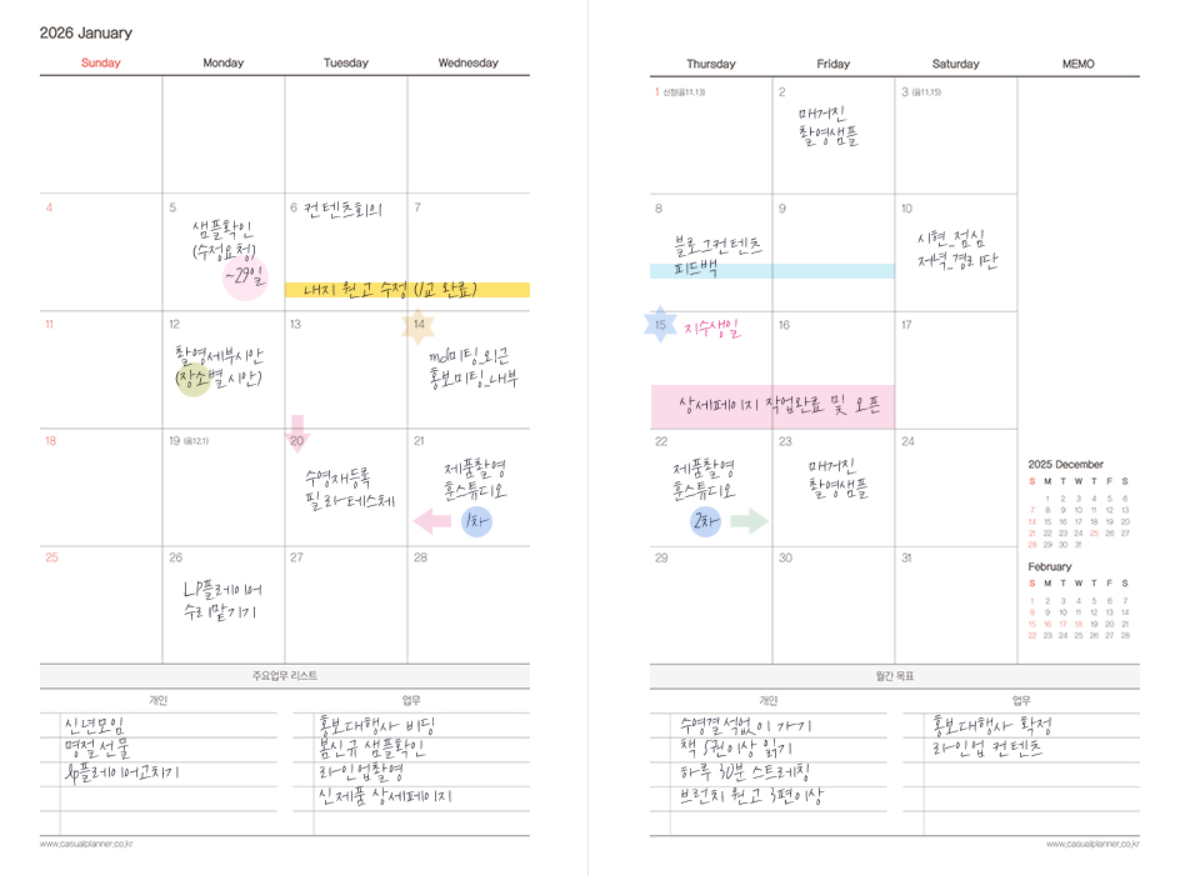 - 2026 캐주얼 플래너 2D1P: 한국 기준 ‘캐주얼’ 라인, 2일 1페이지(2D1P) 레이아웃, 데일리 기록 주요 사용자에게 적합