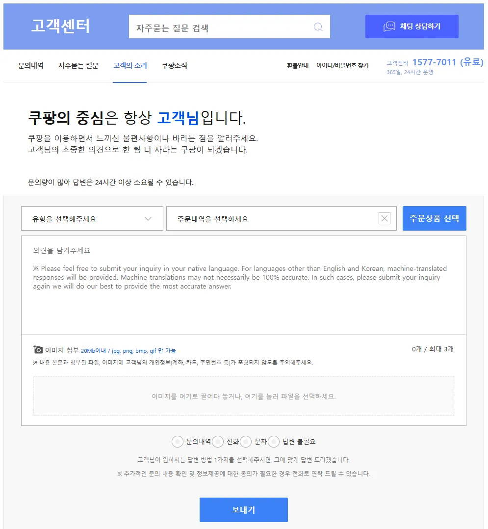 문의량이 급증하여 [쿠팡 고객센터 1577-7011] 연결이 원활하지 않을 수 있습니다.